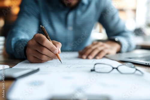 In focus, a person's hand writes on a sheet of paper with a pen, alongside reading glasses resting nearby, depicting a scene of focus and study.