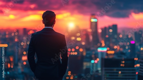 formal, attire, banker, observe, expansive, city, skyline, dusk, setting, sun, casting, rich, array, colours, light, overlay, supply, dreamy, effect, business, businessman, man, success, male, person, modern, suit, sky, adult, building, view, boss, urban, professional, job, young, future, manager, caucasian, standing, looking, office, creative, executive, career, thinking, city landscape, background, sunset