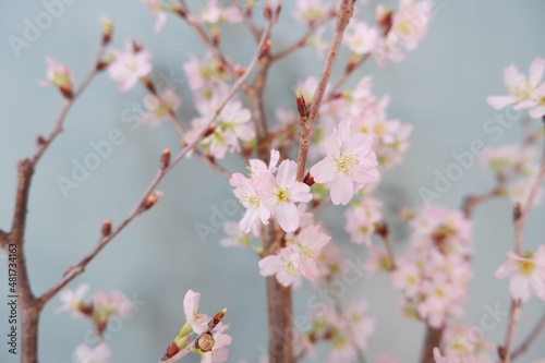 In full blossom of Cherry blossoms on pale green background. Spring, April, Seasonal greeting background. spring greeting card, event banner, background elements