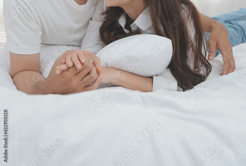 In love new couple at home.Cheerful beautiful young couple relexing on sofa home.Romantict moment.In selective focus. Setup studio shooting.