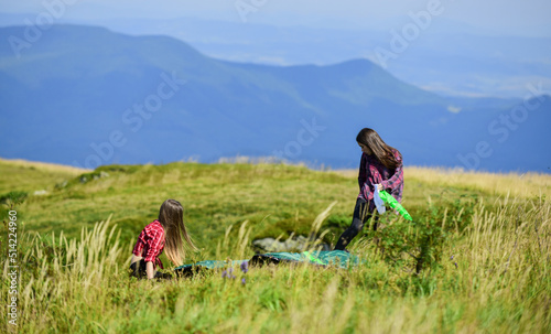 In middle of nowhere. Girls set up tent on top of mountain. Camping and hiking. Summer adventures. Temporary housing. Camping trip. Helpful to have partner for raising tent. Camping skills concept