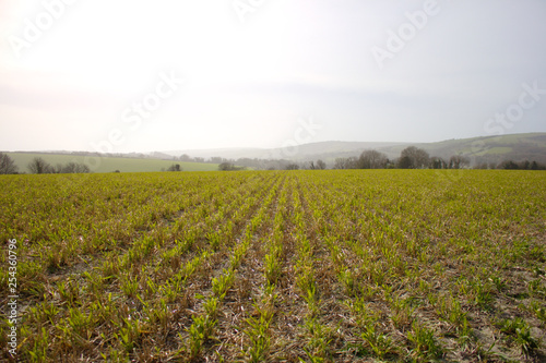 spring, england, springtime, winter, acre, farm, farmland, farming, rural, countryside, sky, green, plant, grain, wheat, planted, row, row