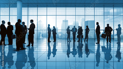 In the contemporary office, professionals network, collaborate, and engage in teamwork discussions. The focus is on dialogue, interaction, and corporate partnerships in a cityscape setting
