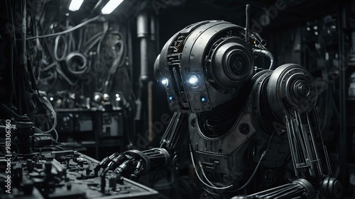 in the dimlylit workshop a quirky droid mecha image