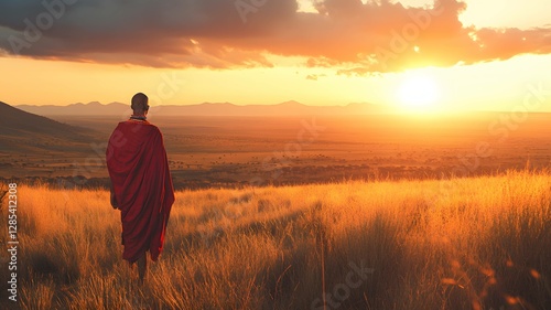 In the fading light of the African savanna, Maasai warriors connect with the land and their ancestors, watching the sun dip below the horizon.