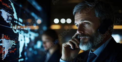 In the future, a male consultant utilizes holographic technology to focus on global networking within a call center setting