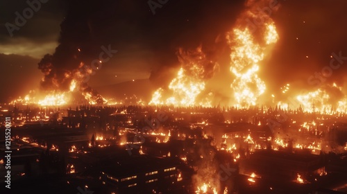 In the heart of a metropolis, relentless flames consume buildings and streets, as dark smoke billows into the ominous sky. Fiery debris rains down, illuminating the devastation all around