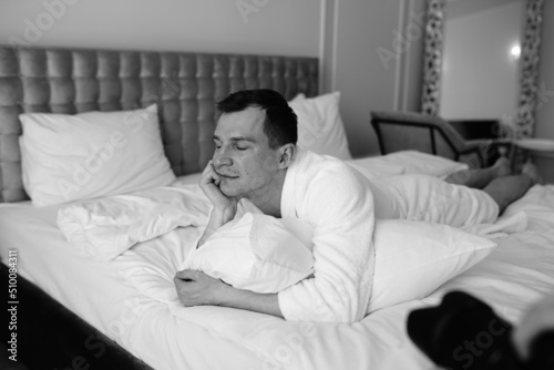 sleepy, bathe, early, laziness, desire, comfort, lifestyle, single, calm, halt, bathrobe, morning, day, insomnia, home, room, relax, bachelor, rest, man, routine, guy, bearded, lazy, photogenic, male, beard, enjoying, caucasian, bed, bedchamber, resting, sleeping, adult, comfortable, relaxation, cosy, cosy, daydreaming