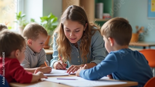 Inclusive Education Portrait: Diverse Students Engaging with Teacher in Classroom Environment
