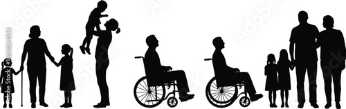 Inclusive family silhouettes, generational diversity, children, elderly, wheelchair users, compassion, love, unity, caregiving, support, accessibility, connection, community, strength
