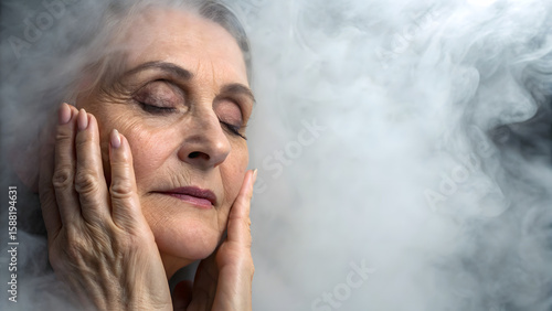 Inclusive Senior Skincare A serene elderly woman embraces tranquility amidst swirling smoke.