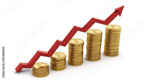 Increasing coin stacks symbolize financial growth and investment success, with upward arrow indicating rising interest and profits