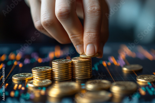 Increasing Coin Stacks with Glowing Financial Graph and lights.
