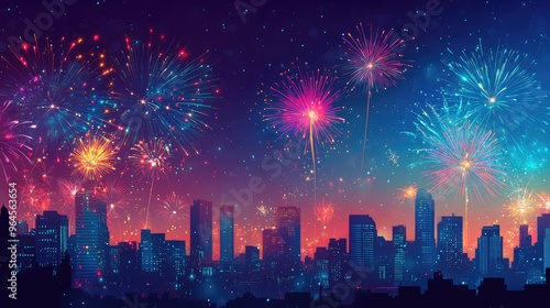 Independence Day fireworks over the city skyline, celebrating patriotism and freedom with a colorful night sky.