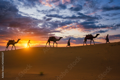 Indian cameleers camel drivers bedouin with camel silhouettes in sand dunes of Thar desert on sunset. Caravan in Rajasthan travel tourism background safari adventure. Jaisalmer, Rajasthan, India