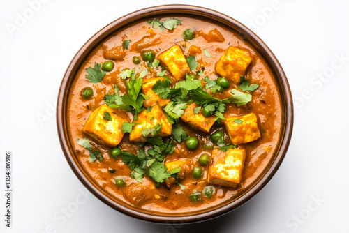 indian, food, curry, dish, cookery, photo, receipe, vegetarian, delicious, appetising, eatery, meal, dinner, lunch, pea, cheese, spice, favor, aroma, creamy, savoury, healthy, home, cooking, eat, blog, styling, gastronomy, culinary, traditional, culture, taste, texture, presentation, top, view, overhead, shot, white, background, brown, bowl, coriander, fresh, warm, spicey