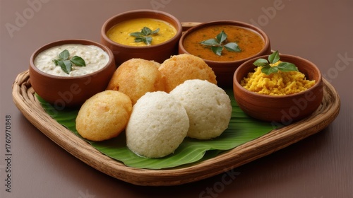 Indian Feast Featuring Golden Vadas, Coconut Chutney, and Colorful Curries Served in Traditional Pots on a Banana Leaf Platter