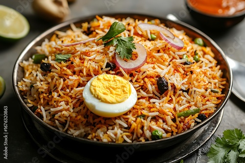 Indian spiced egg pulao with coriander garnish high resolution picture