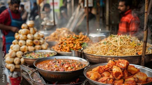 Indian street food scene featuring a busy market stall with dishes like vada pav, dosa, and samosas, surrounded by eager customers