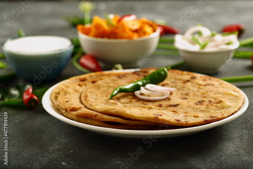 `Indian street foods- aloo paratha served with potato curry and fresh raita.