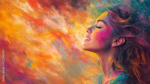 Indian Woman Celebrating Holi Festival with Vibrant Colorful Powder Explosion, Traditional Cultural Celebration Depicting Joy and Happiness, Ai Generated Images