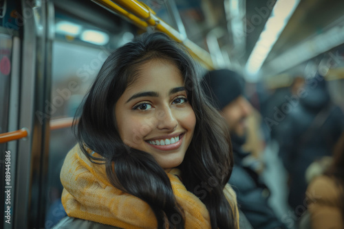 Indian woman with bright smile enjoys her subway commute, capturing joy and vibrancy of daily urban life evoking sense of connection and shared experiences in bustling metropolis