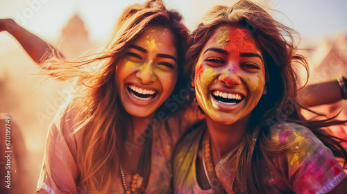 Indian young woman celebrating Holi festival with traditional dresses and ornaments.