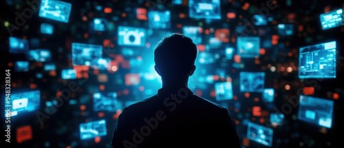person, technology, datum, silhouette, surround, glow, screen, depict, immersion, information, habit, update, bombardment, platform, distraction, struggle, landscape, attention, engagement, design, overload, headline, input, culture, network, response, interface, message, feedback, background