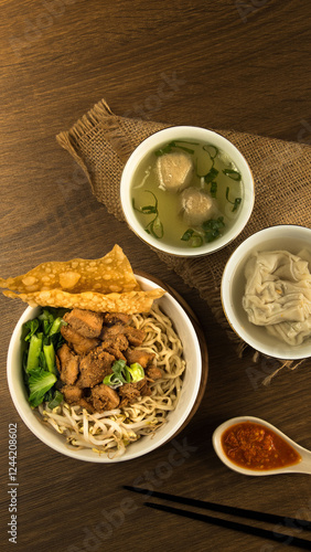 Indonesian mie ayam or chicken noodles, Hot bowl of noodles topped with chicken and vegetables, accompanied by wontons and savory soup on a rustic wooden table