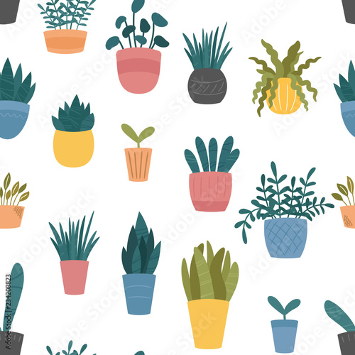 Indoor home plants in ceramic pots seamless pattern. Vector background, cute Scandinavian flat cartoon style. Potted flowers and sprouts colourful design