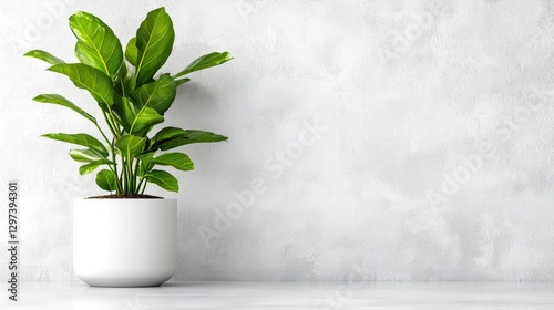 Indoor plant, white pot, grey wall, minimalist design, home decor
