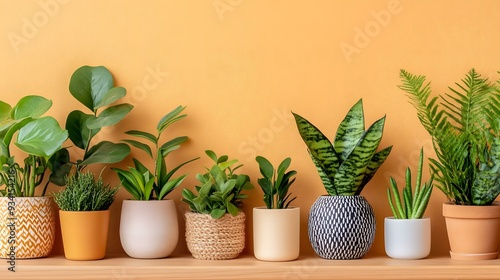 Indoor Plants on a Wooden Shelf with Yellow Background