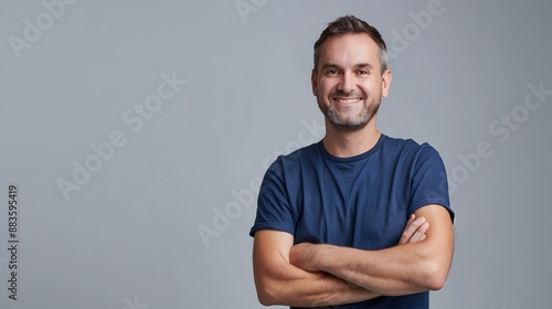 Indoor portrait of young european caucasian man isolated on gray background, standing in blue t-shirt with crossed arms, smiling and looking straight at camera.