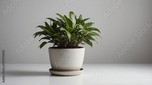 Indoor potted plant with lush green leaves on a minimalistic table against a soft background in natural lighting