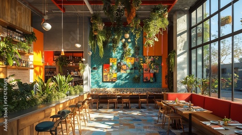 eatery, interior, design, plant, greenery, dining, space, wooden, furniture, chair, table, decor, wall, art, colourful, bright, light, sunlight, window, modern, contemporary, style, indoor, room, bar, seating, arrangement, tile, pattern, hanging, light, ceiling, open, airy, vibrant, comfortable, natural, fresh, inviting, ambience, atmosphere, urban, jungle, cafeteria, eatery, lunch, dinner, lounge, casual attire
