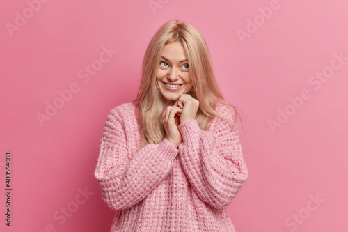 Indoor shot of pleased blonde young woman keeps hands together and has dreamy positive face expression dressed in loose knitted sweater isolated over pink background. Face expressions concept