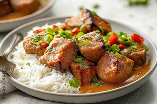 Indulge in the rich flavors of Bicol Express, a popular Filipino dish made with tender meat, served over fluffy rice, and garnished with fresh herbs and chili peppers.