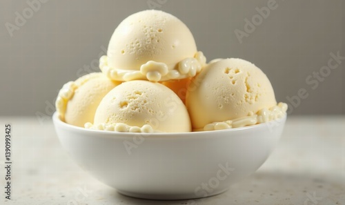 Indulge in this creamy, delicious ice cream scoop stacked in a white bowl. Perfect for desserts, summer treats, or food advertisements.