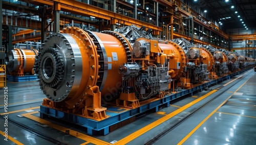 Industrial Aircraft Engine Assembly Line. Row of large aircraft engines on an assembly line in an industrial setting, showcasing the scale of aerospace manufacturing.