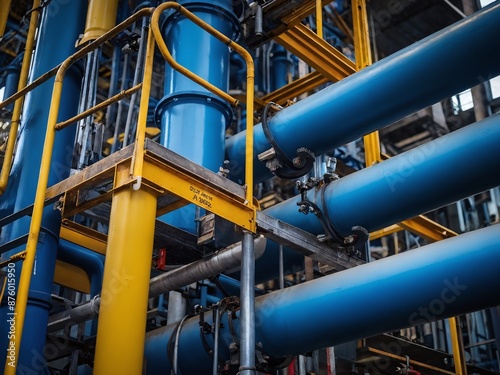 industrial, pipe, factory, blue, yellow, balustrade, infrastructure, network, complex, setting, maintenance, inspection, overhead, access, metal, steel, construction, manufacturing, industry, machinery, equipment, process, technology, production, energy, power, engineering, system, plumbing, piping, fabrication, assembly, support, safety, work, environment, detail, closeup, perspective, view