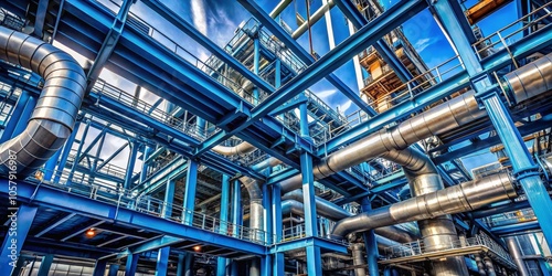 mechanical, high technology, modern, connectivity, steelwork, blue, closeup, steel industry, detailed, futuristic, metalwork, pipe, structure, industrial, composition, beam, steel, industrial revolution, metal, innovation, progress, network, symmetry, modern architecture, engineering, precision, complexity, construction, geometric, architectural, industrial design, technology, dynamic, intricate