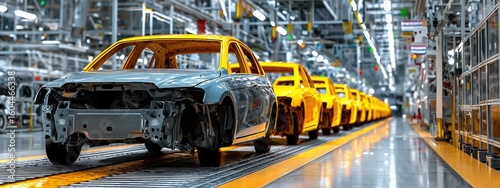 Industrial Car Manufacturing Scene with Rows of Yellow Cars in Factory Setting Highlighting Production Process and Assembly Line Efficiency