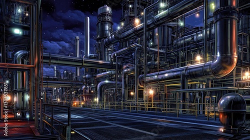 industrial, complex, night, illuminated, pipe, structure, manufacturing, facility, technology, machinery, energy, factory, engineering, metal, metalwork, architecture, production, blueprint, design, construction, equipment, operation, illumination, urban, environment, plant, system, power, material, landscape, industry, worksite, scene, setting, dark, texture, detail, steel, men at work, infrastructure, economy, modern, shadow, development, connectivity