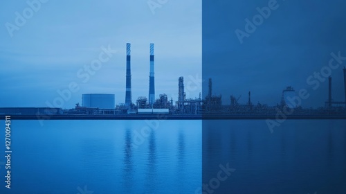 Industrial Complex Near Water, Reflection. Blue Tone.