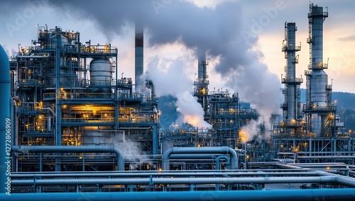 Industrial Complex: Refining Processes and Emissions at Dawn