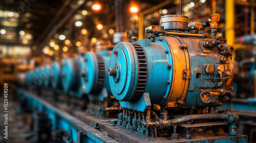 industrial compressor in production. Factory machine, energy, power equipment. Modern tech. Manufacturing system, engineering structure, mechanical parts, metal tubes, cylinder. Plant --chaos 35 --ar