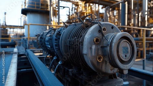 Industrial electric motor detail, showing connections and rugged design within a petrochemical plant.