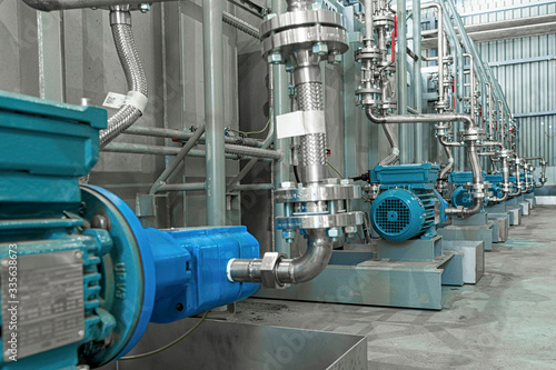 Industrial equipment. New blue electric motors with pumps on the stainless steel production line. Industrial background. Additive pump station in petrochemical technology.