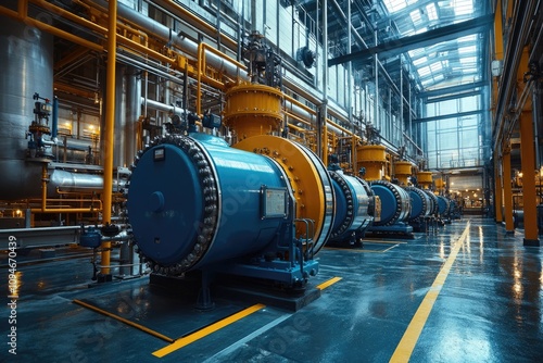 power plant, industrial, equipment, energy, production, turbine, machinery, factory, engineering, technology, power, industry, manufacturing, electricity, generator, pipeline, system, interior, metal, steel, pipe, gauge, control, automation, operation, modern, facility, clean, efficient, innovation, infrastructure, gas, oil, fuel, resource, distribution, supply, process, complex, high technology, blue, yellow