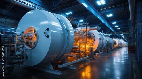 factory, industrial, manufacturing, technology, machinery, equipment, plant, production, industry, workshop, engineering, automation, machine, metal, steel, cylinder, pipe, tube, light, blue, orange, illumination, modern, clean, bright, interior, architecture, design, building, structure, space, large, long, line, process, system, complex, facility, work
